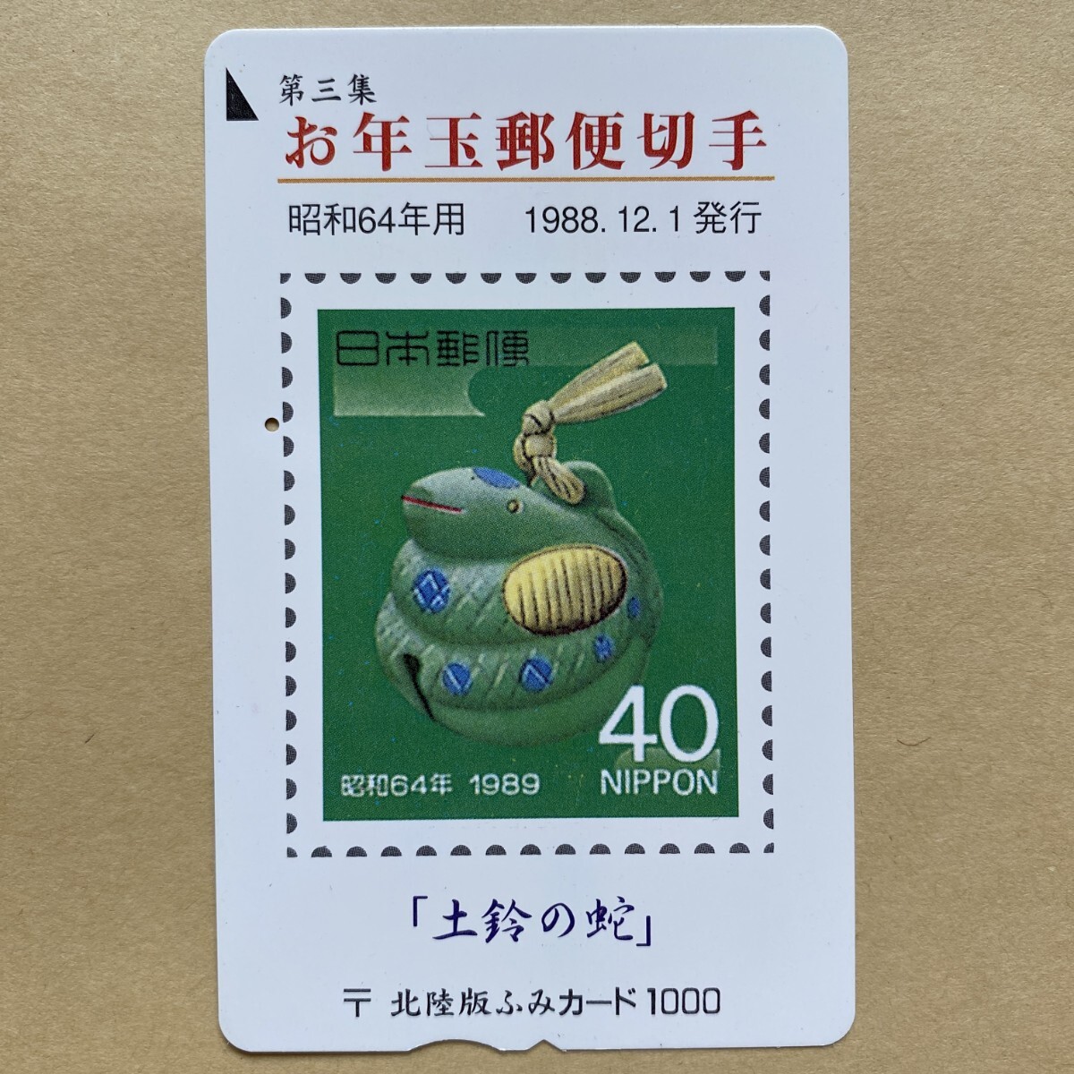 > 【使用済】 ふみカード 北陸版 第三集 お年玉郵便切手 昭和64年用 1988.12.1発行 「土鈴の蛇」