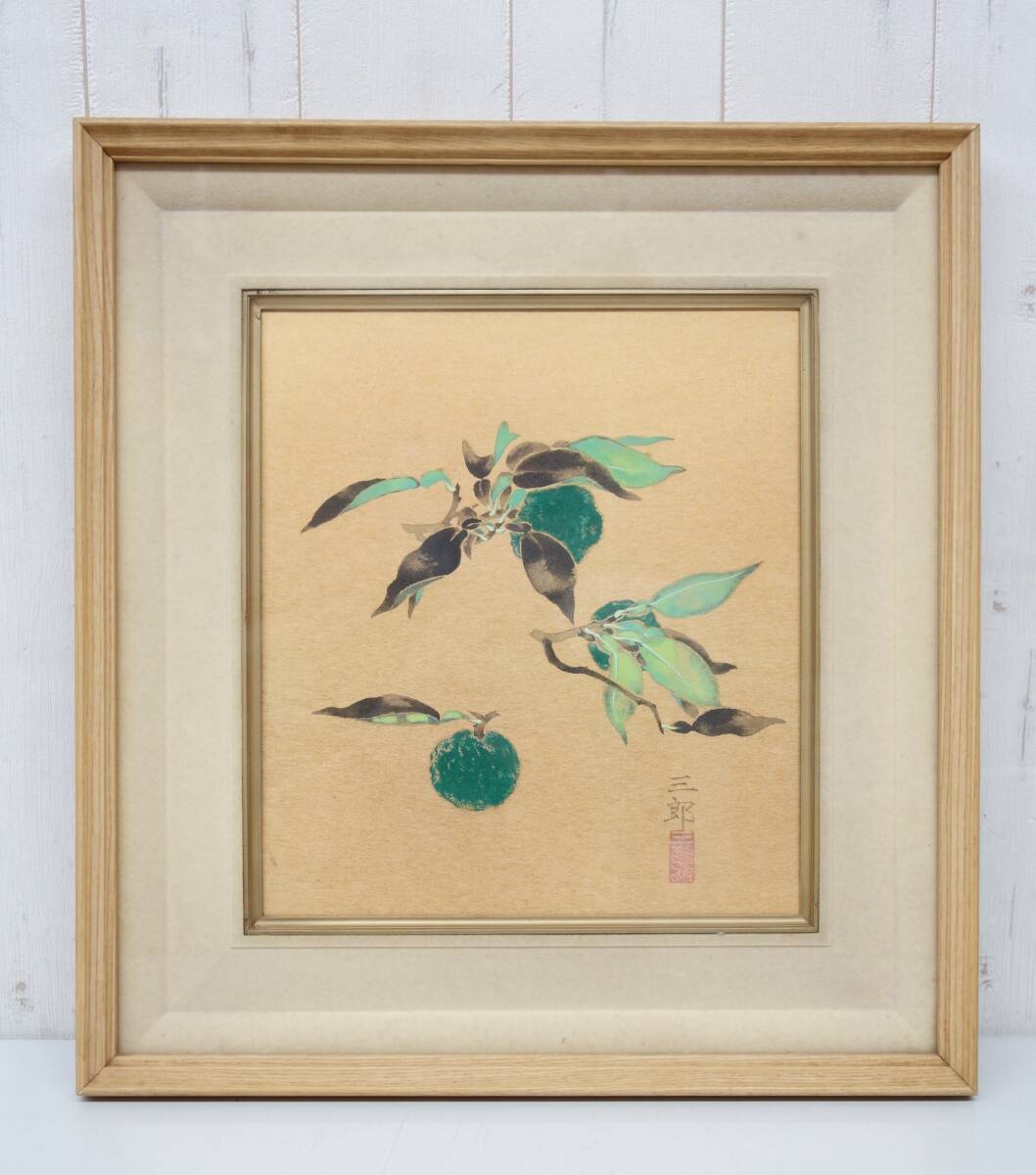- 額装 美術品 *青柚子 あおゆず *三郎 銘 さぶろう *金色紙 木製枠 ガラス窓 *詳細不明 *みかん 柑橘類 日本画 落款