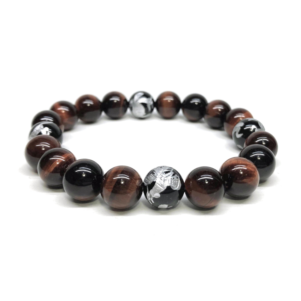 - 10mm 四神獣銀彫オニキス×レッドタイガーアイ パワーストーン ブレスレット天然石 運気上昇 開運 金運 恋愛運 お守り 青龍 白虎 玄武 朱雀