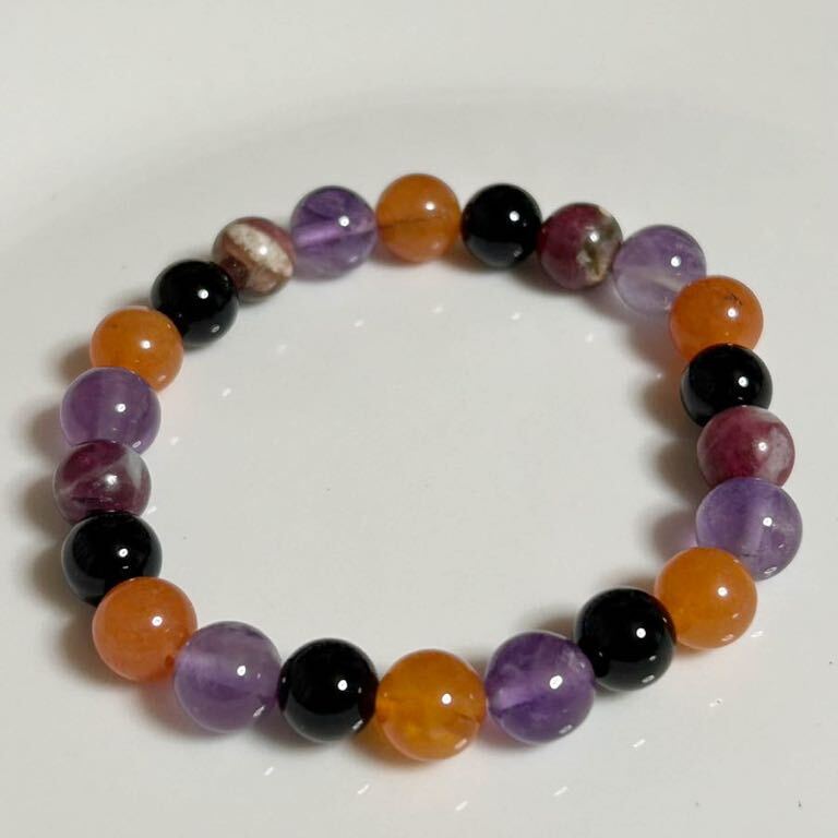 > 天然石★ハロウィン仕様 ブレスレット★8mm 15.5cm オレンジカルサイト オニキス アメジスト ピンクトルマリン