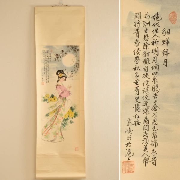 - C10379 桃色の服を着た美人に黄色い花の掛軸《真作保証》