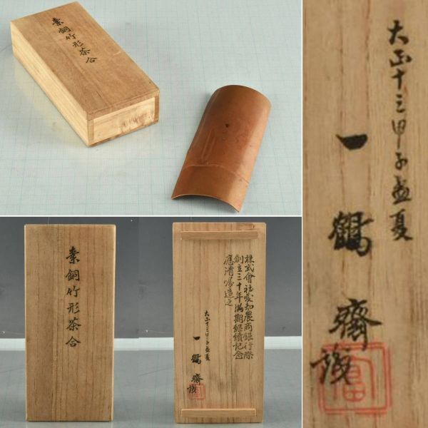 - C09367 一鶴斎 素銅竹形茶合:真作