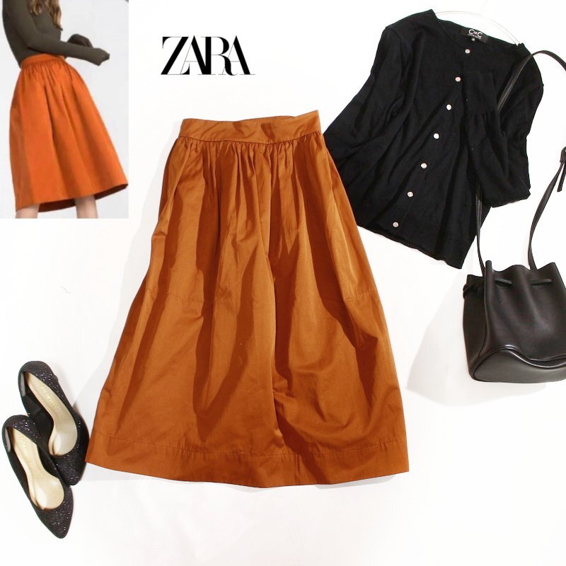 > 美品 ZARA woman ザラ ウーマン オールシーズン 人気 ふんわり ロング丈 ミディ ギャザースカート XS オレンジ ブラウン お洒落