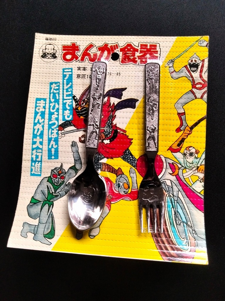 - '70s 特撮ヒーロー まんが食器 当時物 未使用 エッチング 仮面ライダー ウルトラマン !! ☆ パッケージ 月光仮面 変身忍者嵐 シルバー仮面