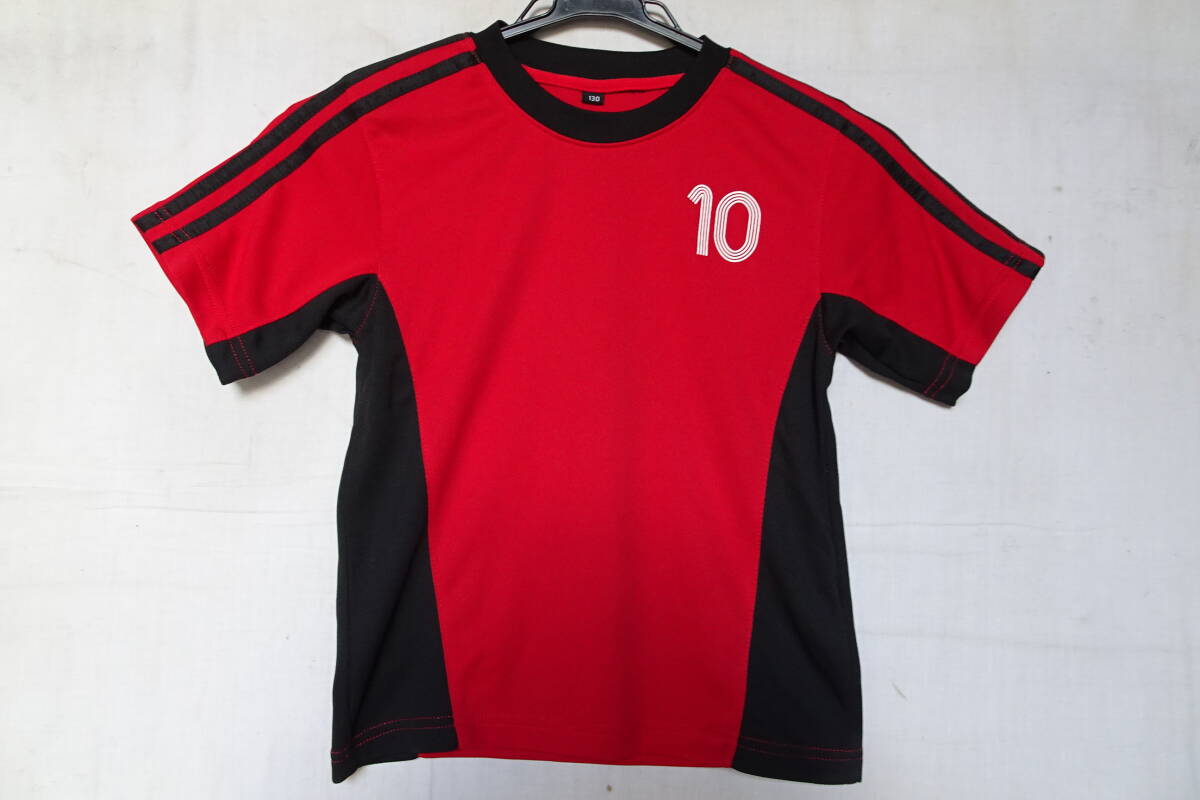 - 半袖Tシャツ/ユニフォーム/ジュニア/サッカー/速乾性素材/肩から袖黒2本ラインテープ袖下・身頃脇黒切替/赤/レッド/130サイズ(9/4R)