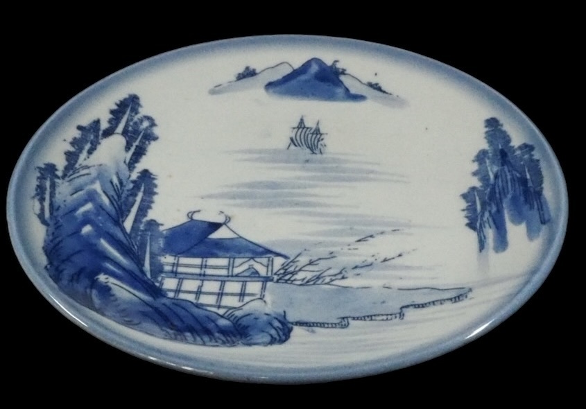 - 明治期ビンテージ 有田焼 染付手描山水楼閣図飾り皿 皿 染付 山水 楼閣 TEF609