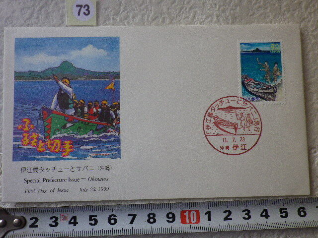 - FDC ふるさと切手 伊江島タッチューとサバニ・沖縄県 1貼1消 解説書有●73●