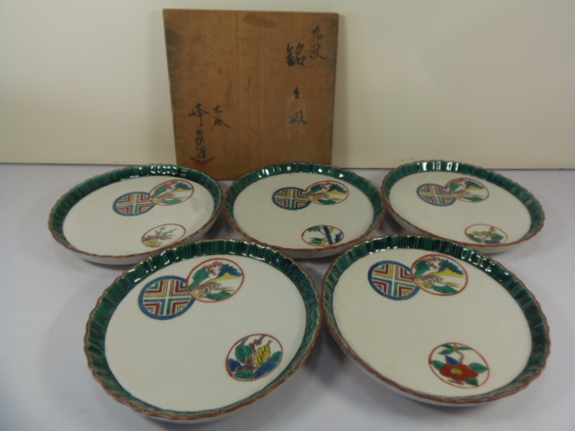- s793 【九谷焼 九谷峰泉】 小皿 銘々皿 丸紋 絵変り 5客セット