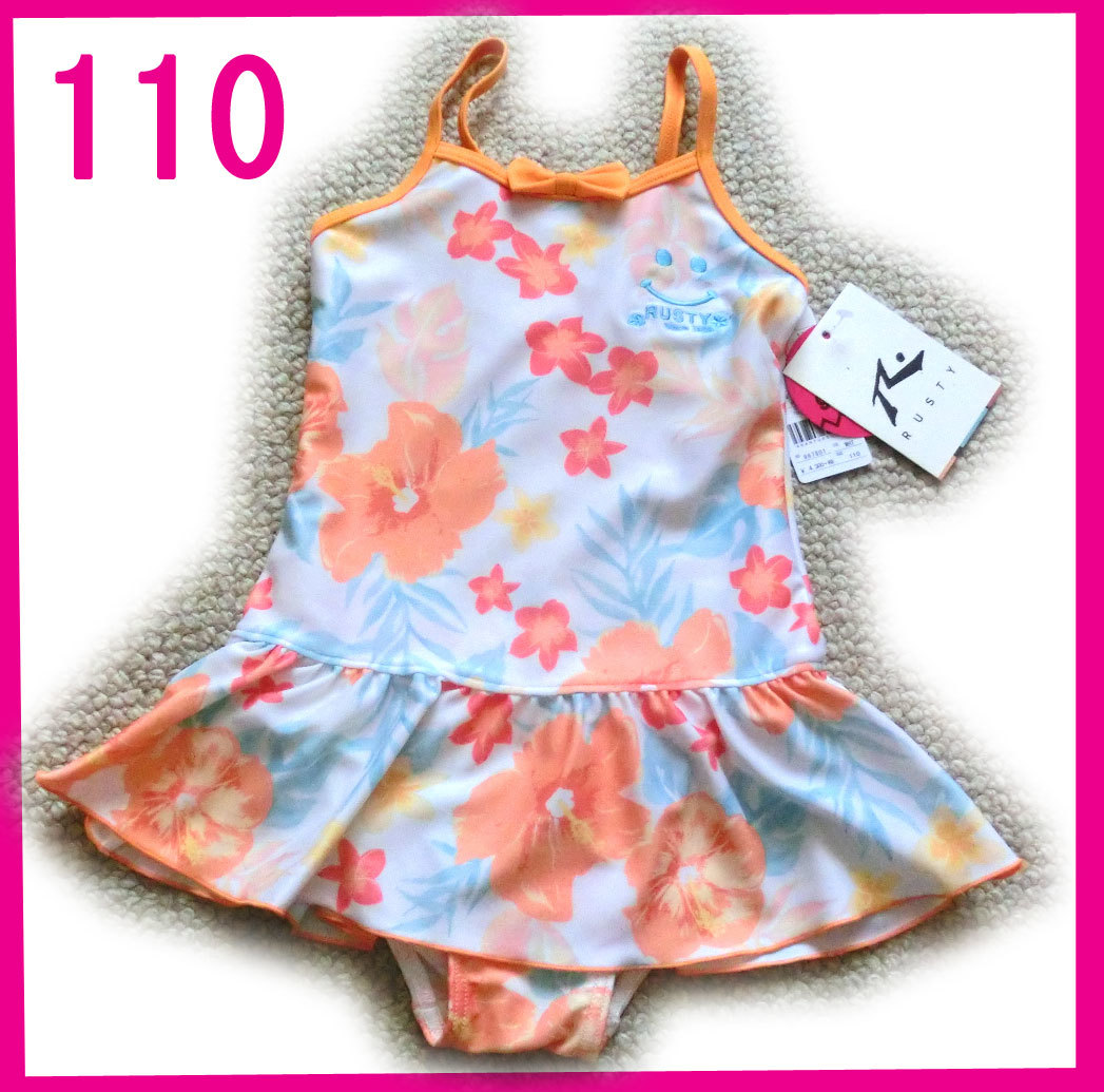 - 2 新品 100010 RUSTY ラスティ ワンピース 水着 オレンジ系? 110cm 967801 女児 スイムウエア UVカット プール