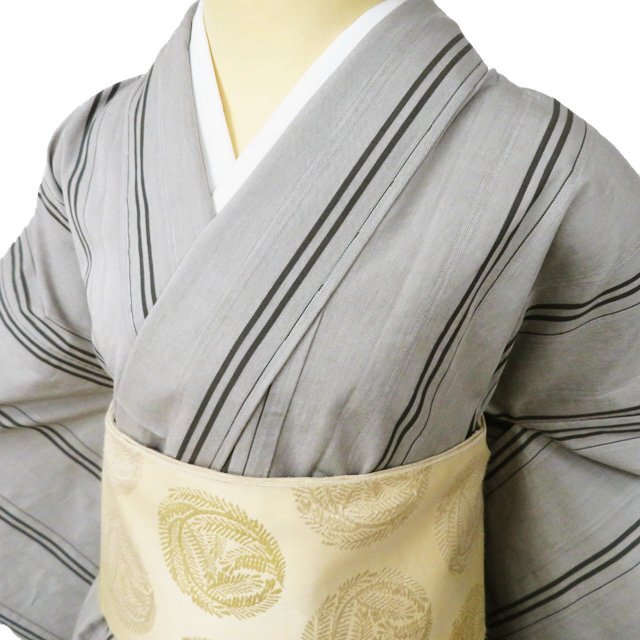 - 播包 新品 播州織 着物 木綿 単衣 カジュアル 縦縞模様 反端付き かなり薄い柴色 身丈167cm 裄68cm L トール きもの北條 A1086-3