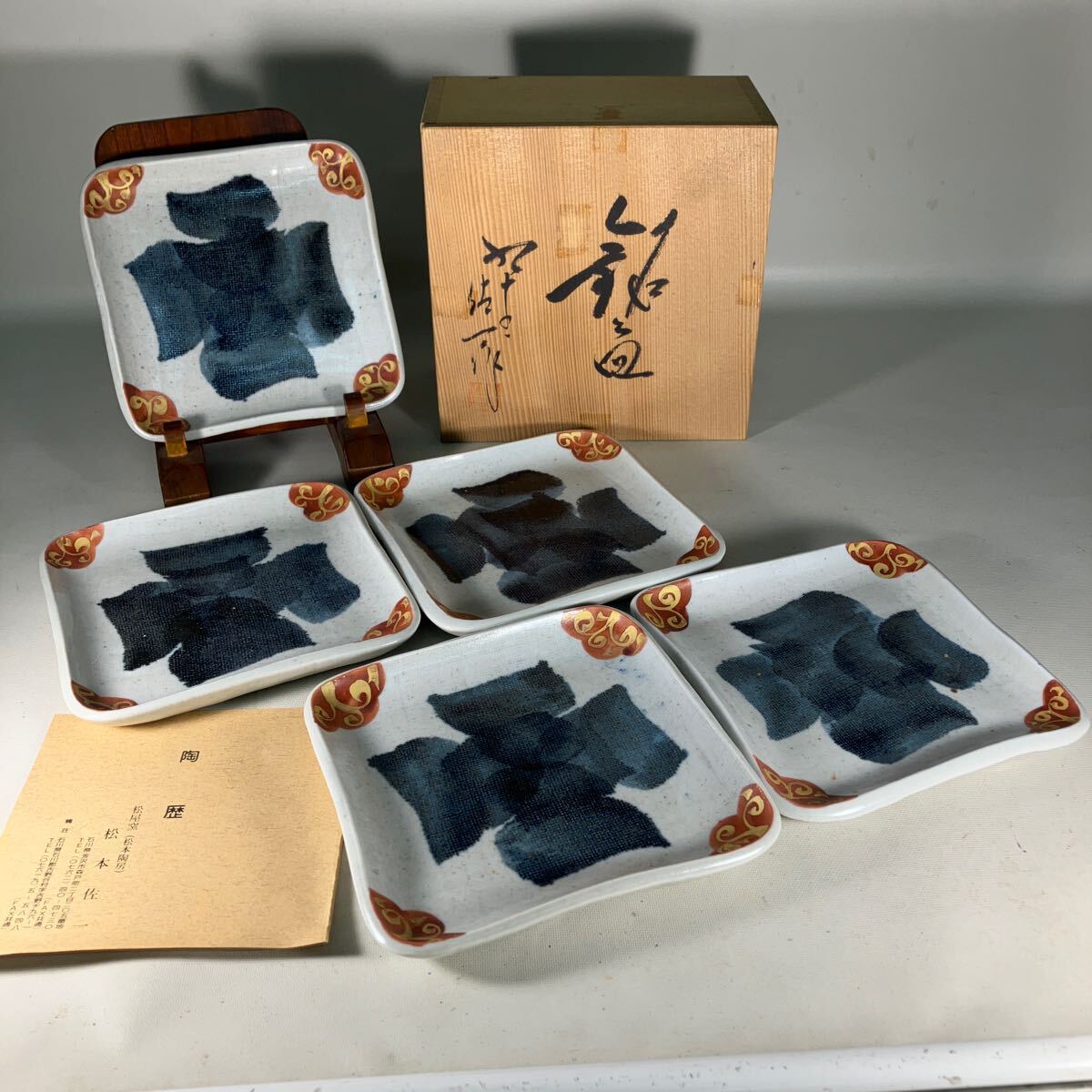 - 松本佐一造 銘々皿 5客 共箱 陶暦 角皿 九谷焼