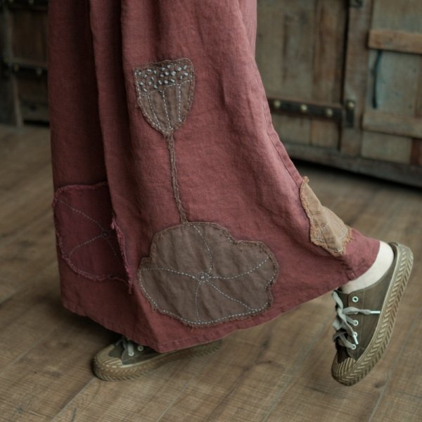 - lgn 2025 スカート 刺し子 貼り花柄 襤褸 アンティーク風 洋服ミックス ロマンファッション ポップ 楽ちん 花柄 麻100%リネン 錆色