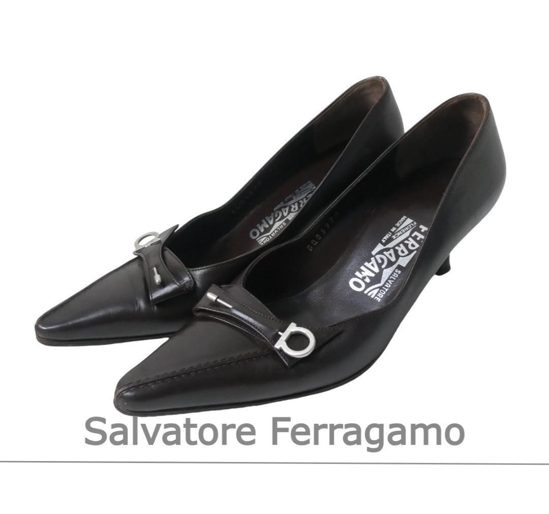- Salvatore Ferragamo サルバトーレフェラガモ サイズ4.5C 約22㎝ ガンチーニ ポインテッドトゥ ローヒール パンプス ダークブラウン こげ茶