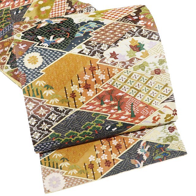 > 袋帯 未使用 正絹 フォーマル 仕立て上がり 全通 明綴れ 松皮菱 花鳥模様 鶴 マルチカラー 多色 金 きもの北條 A1089-16