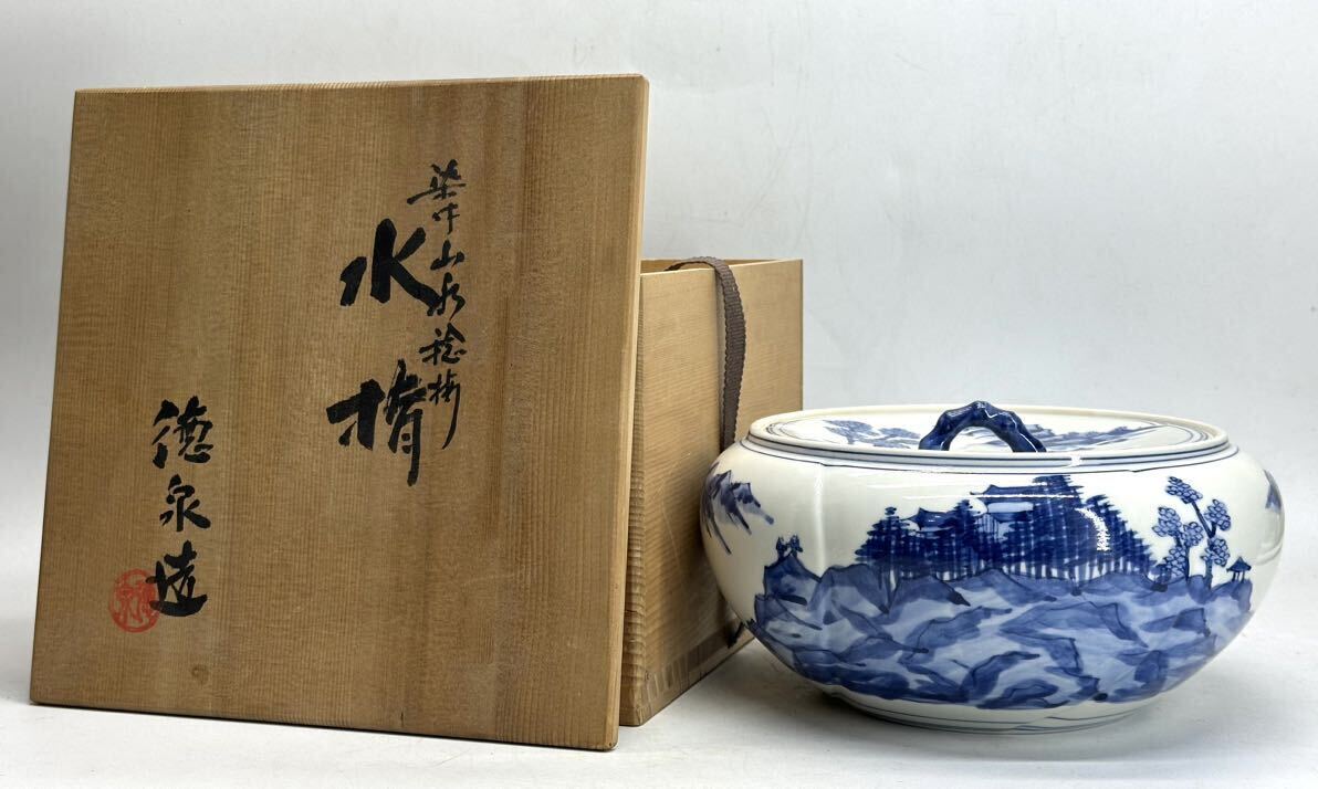 - 西村徳泉 染付山水捻梅 京焼 水指 共箱 茶道具