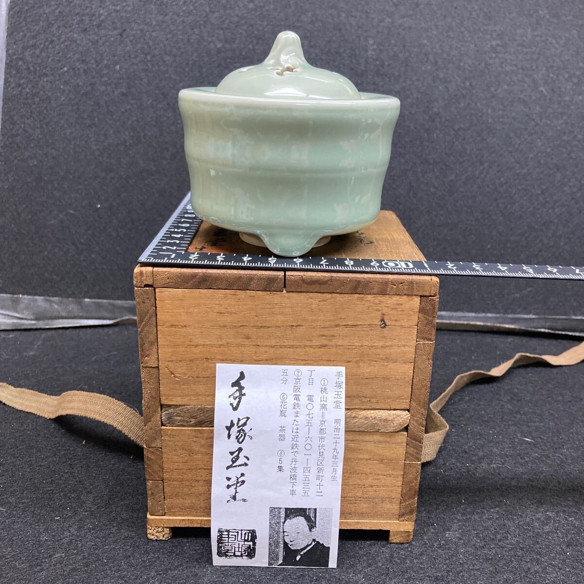 > 京焼き 名工手塚玉堂造(物故作家) 青磁 三足 香炉 共箱付き (共箱に傷み有り) アンテーク