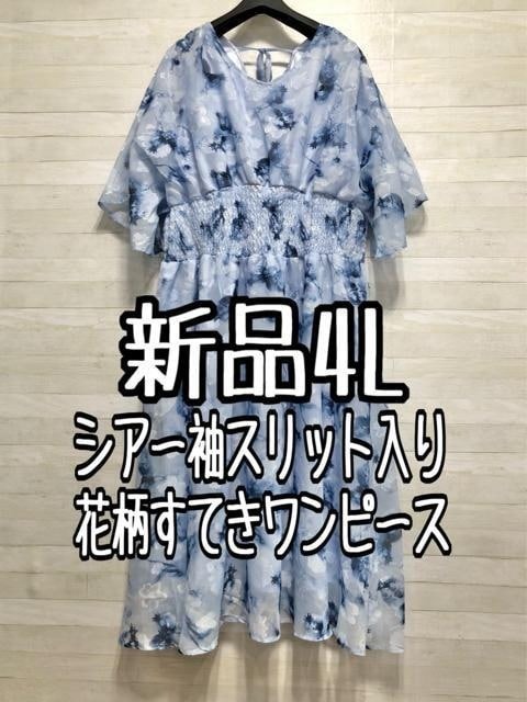 - 新品☆4L♪ブルー系花柄♪すけ感♪爽やかフェミニンワンピース☆f444