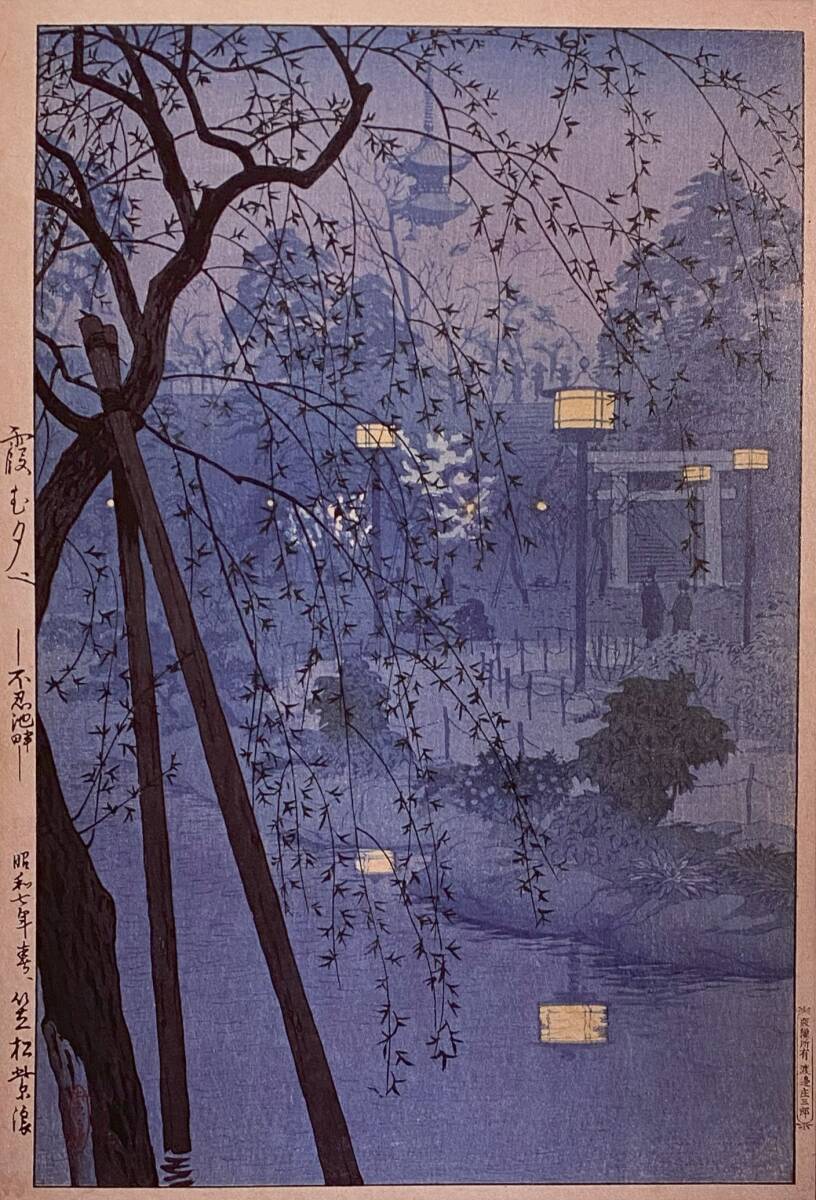 - 笠松紫浪、〈霞む夕べ不忍池畔〉、希少画集画、高級新品額・額装付、状態良好、送料込み