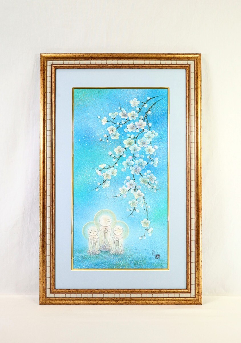 > 真作 丸山寿美 日本画「お地蔵様」画31×58cm 兵庫県出身 仏教美術画作家 愛の仏画師 モダンな画風と仏教美術の融合 優しさ満ち溢れる 9762