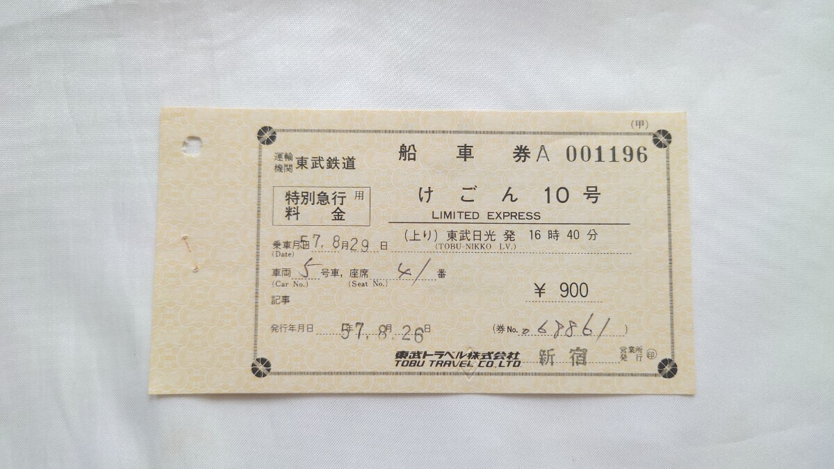 - ▽東武鉄道▽けごん10号船車券▽軟券昭和57年