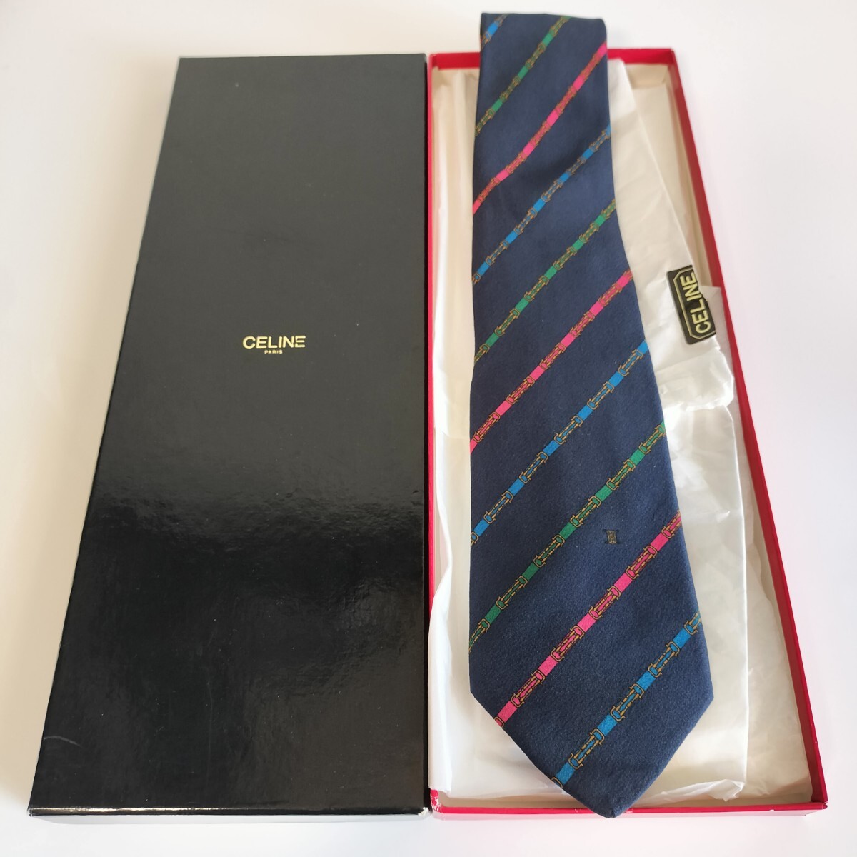 - CELINE(セリーヌ)紺マルチカラーストライプワンポイントマカダム柄ネクタイ
