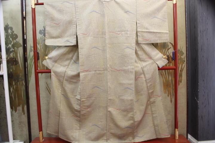 > きもの今昔7665 ウールのきもの 広衿単衣セブセ付き手縫い仕立 浅いベージュ色地シルク入り 身丈152cm