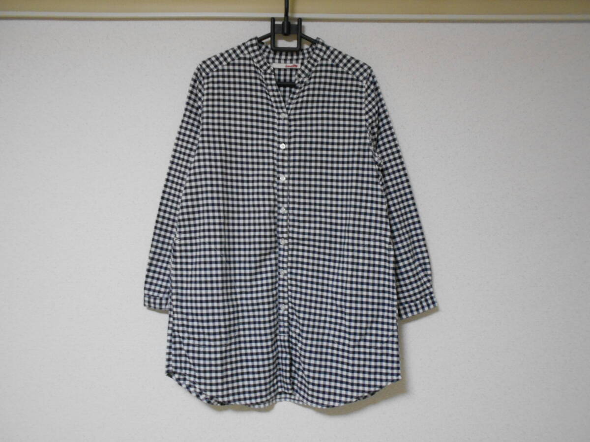 - SUN VALLEYサンバレー☆生成り白×黒ギンガムチェック柄 長袖シャツチュニック☆すっきり襟なし♪丈長シャツ☆コットン素材☆Mサイズ☆美品