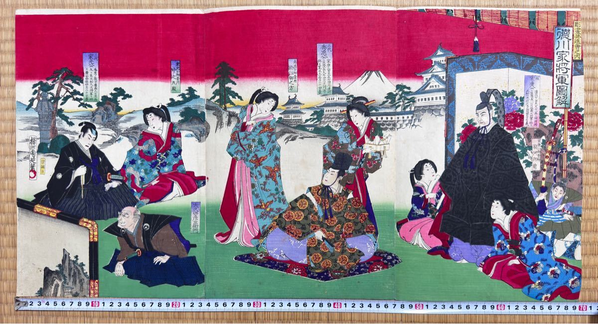 - 明治期/真作 楊洲周延「德川家将軍図解」本物浮世絵木版画 武者絵 錦絵 大判 三枚続き