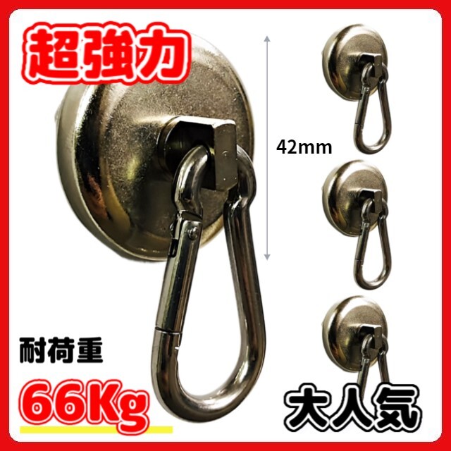 > (A) 超強力 マグネットフック カラビナ 42mm 4個セット ネオジム磁石 強力 磁石 耐荷重66Kg ステンレス マグネット 防錆 防水