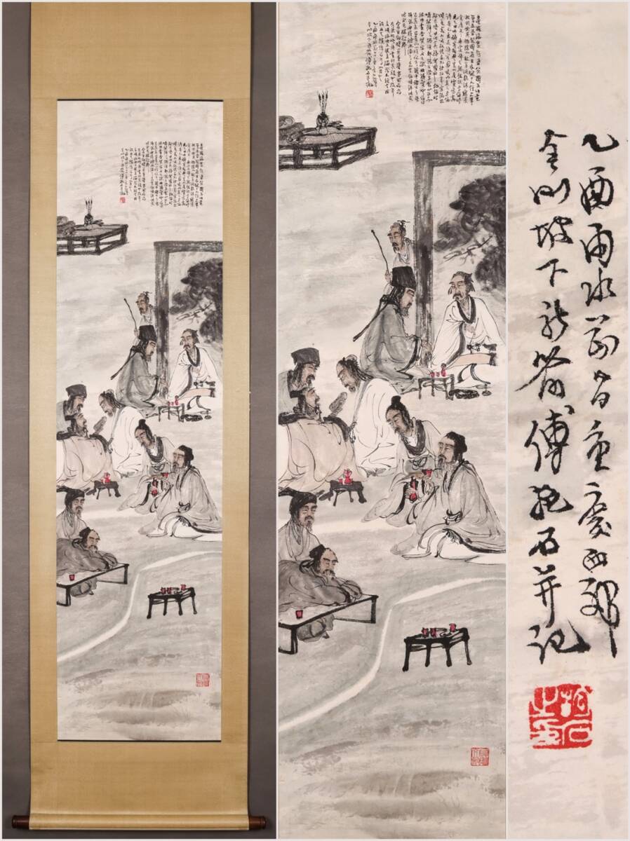 - 古美術 掛け軸 中国・近現代 「傅抱石書」 紙本 【高士雅集図】 立軸 書道 巻き物 真筆逸品 肉筆保証 唐物 古画 LT-2410126