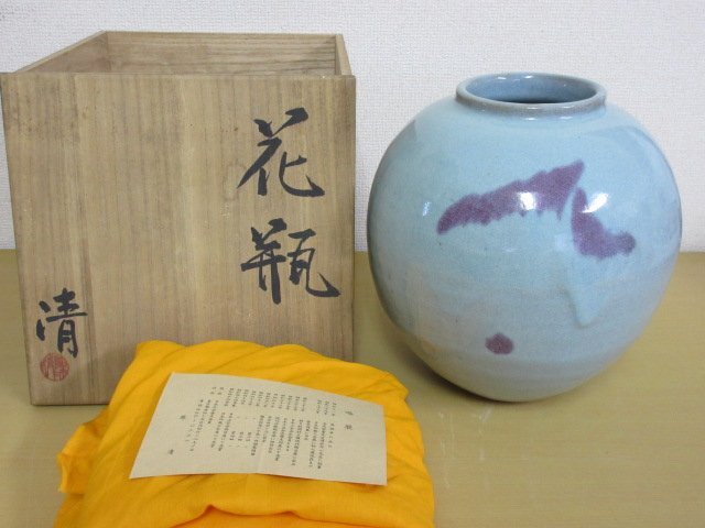 > 人間国宝 原清「釣窯 花瓶」共箱 栞 黄布 高さ約25.5cm 陶磁 花入れ 花器 送料無料!