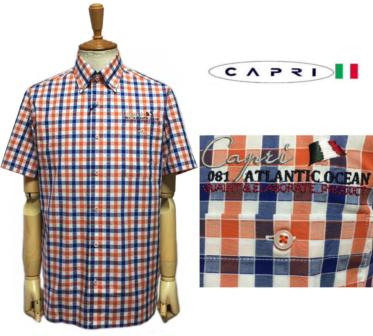 - CAPRI カプリ 清涼 上質綿 ロゴ刺しゅう ブロックチェック ボタンダウン 半袖シャツ オレンジ size46 M
