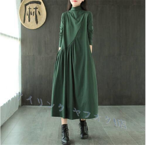 > 新品☆秋カジュアル ゆったり 20代30代40代50代大きいサイズ 長袖Aライン ロングワンピース 緑 M~3XLサイズ