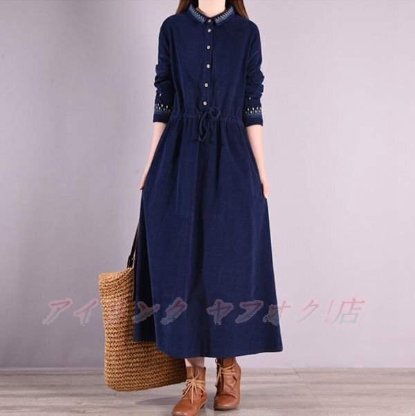 > ☆新品カジュアル マキシワンピース 刺繍入り 長袖 ゆったり コーデュロイ 着やせ ロング丈ワンピース 大きいサイズ 紺