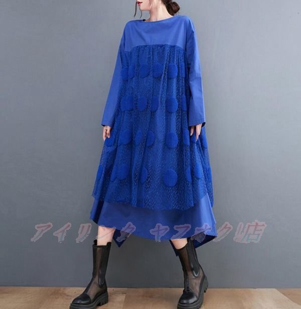 > ☆新品秋 カジュアル ゆったり 20304050代 おしゃれ 体型カバー大きいサイズ長袖マキシロングワンピース ブルー