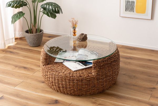 - 【アバカ ラウンドテーブル】ローテーブル センターテーブル ガラステーブル 円形 収納棚 アバカ 天然素材 リゾート ラウンジ アジアン