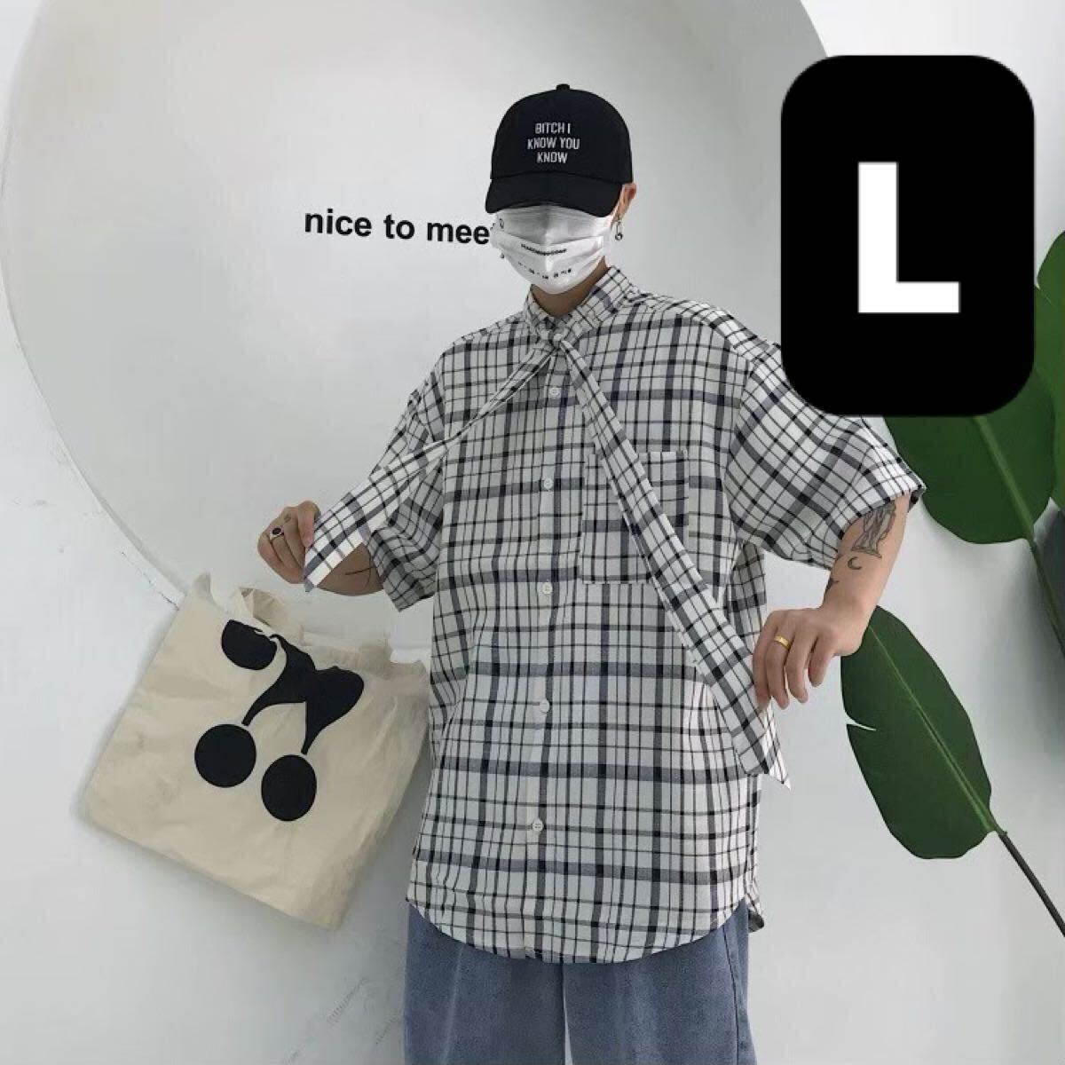- シャツ タイ アウター ビッグシルエット チェック トップス 半袖 トレンド ストリート 人気 オルチャン メンズ レディース ホワイト 白 L