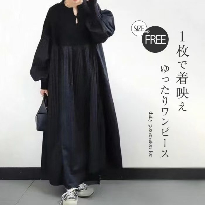 - LRM4569★ロングワンピース マキシ丈ワンピース ニットワンピース 異素材 レディース 大きいサイズ 切替ワンピース 重ね着風