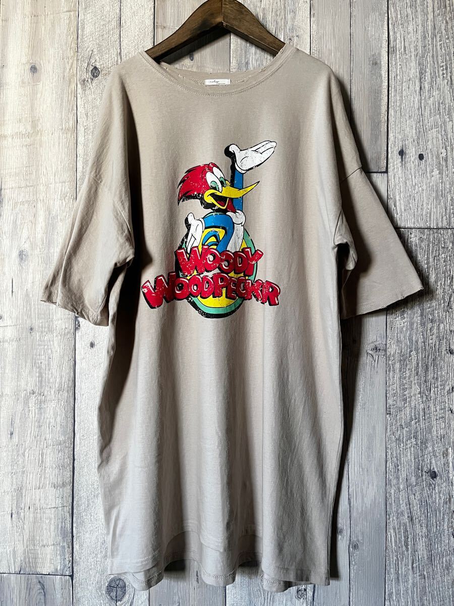 - ■おしゃれデザイン■ WOODY WOODPECKER クラッシュ加工 Tシャツ ビンテージ風プリント ベージュ USJキャラ ユニバコーデ 韓国ファッション