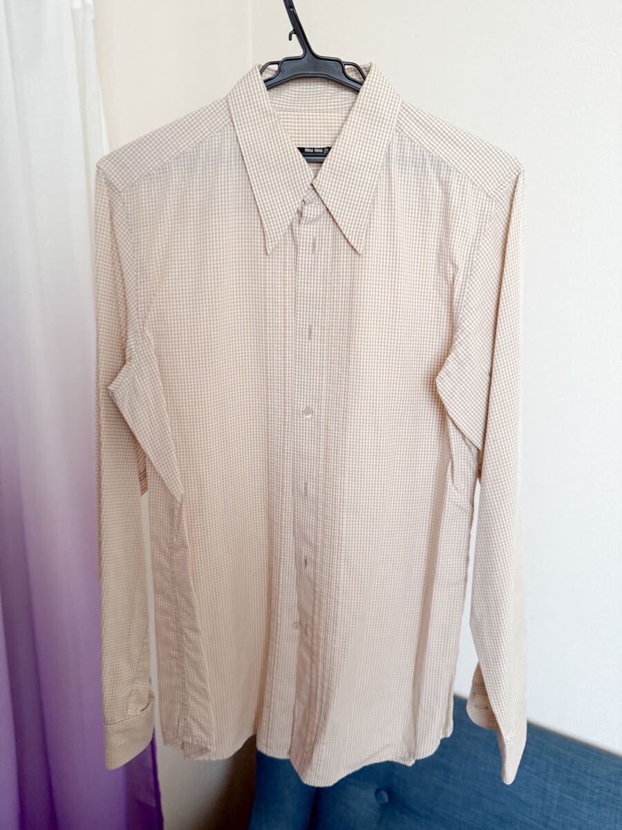 > ★miumiu ミュウミュウ メンズライン コットンシャツ チェック柄サイズ39 ベージュ系★フリル ダーツ ドレスシャツ 長袖 シャツ コットン