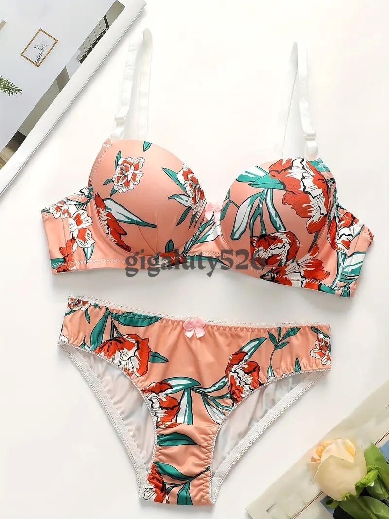 - 【送料無料】レディースセクシーランジェリーセットフローラルプリントアンダーワイヤーキャミブラ&パンティ(カラー:花柄ピンク/サイズ:M)