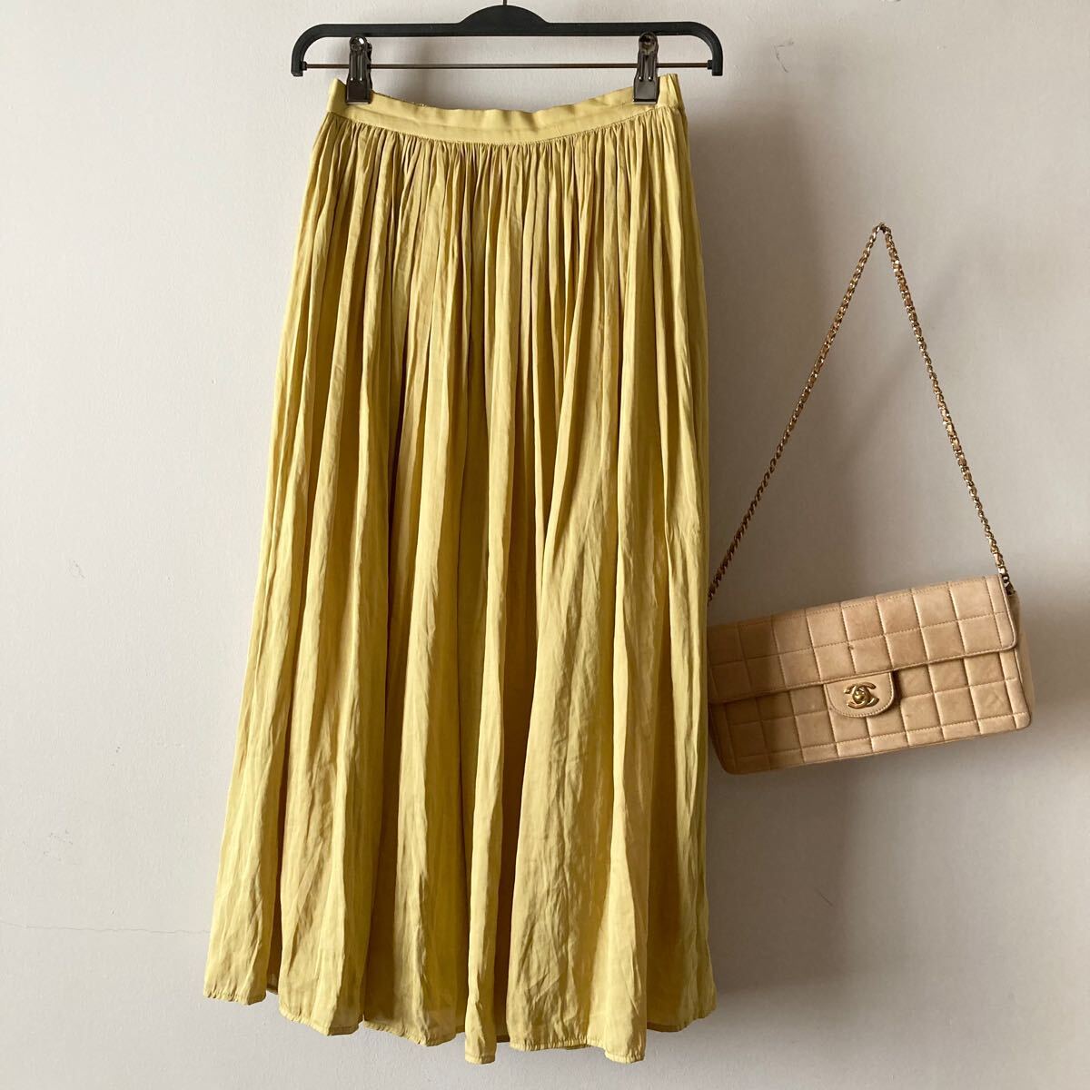 - パールマシェール*上質シワ感サテン ゆるいロングフレアスカート 1.5万*イエロー