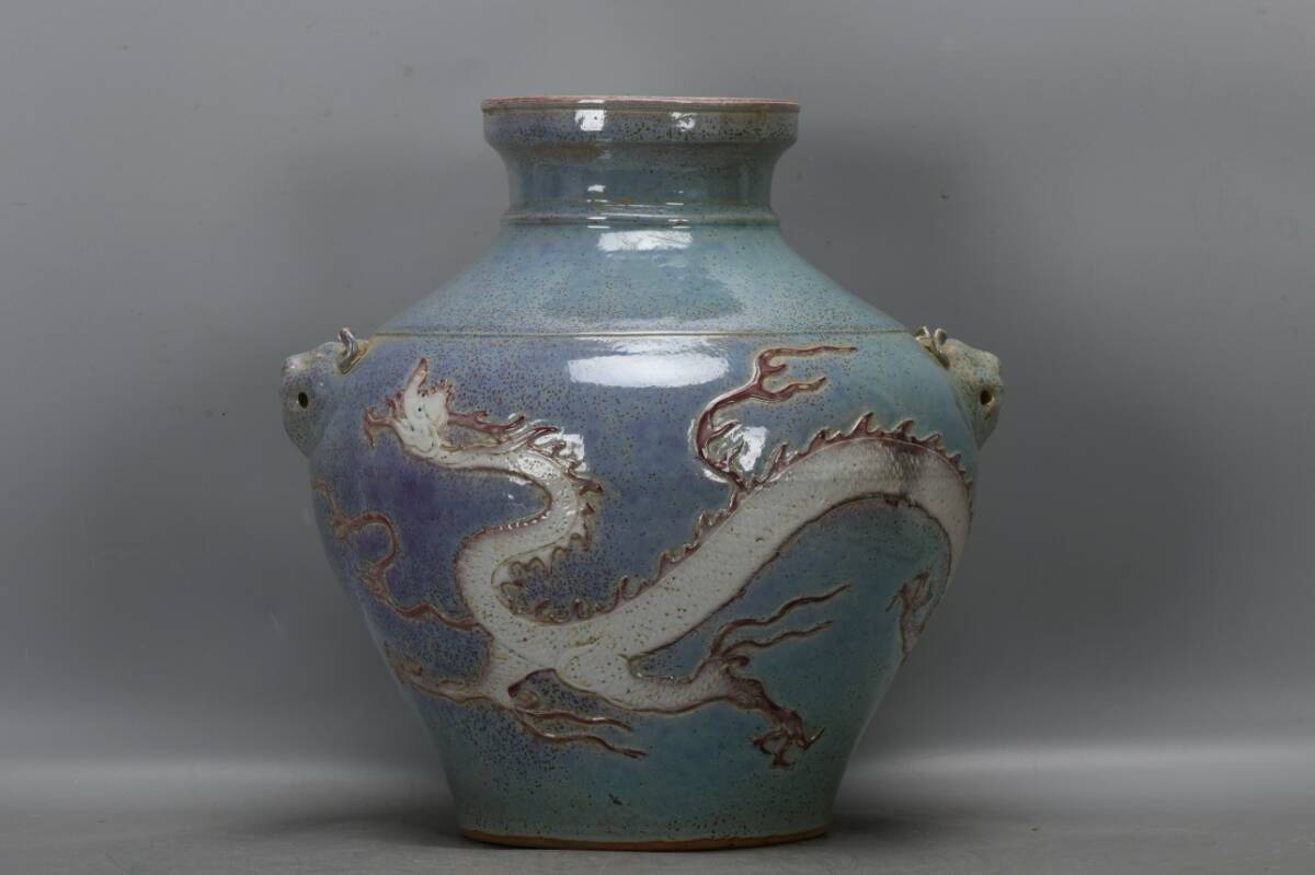 - ◆蔵出◆古美術 中国古玩 元時代 曜変 浮雕 留白龍狗頭罐 時代物 A04
