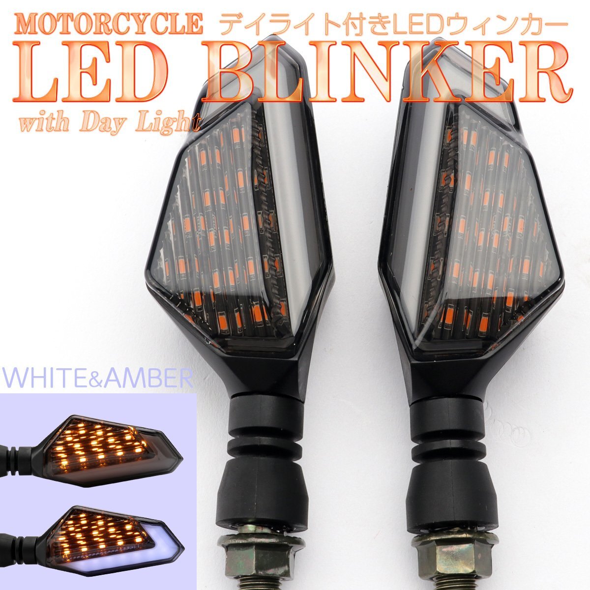 > 汎用 LED ウインカー 多角形デザイン ホワイト デイライト マーカーランプ付き スモークレンズ ライトチューブ入り F-503W