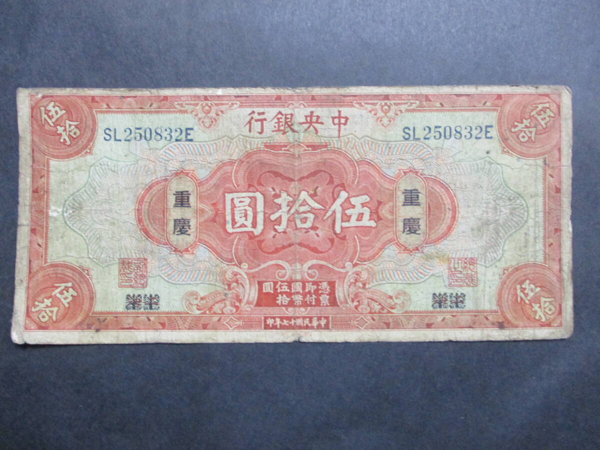 - ★中国紙幣 中央銀行 伍拾圓(重慶) 中華民国17年印 1枚★