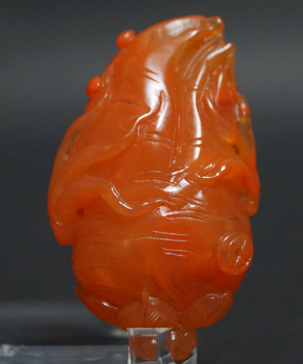 - 【閑】古代メノウ南紅(なんこう)瑪瑙 清 細工彫り『人参如意』根付 緒締玉 提げ物 装飾品☆美しい石目☆希少品 長さ4.6㎝★時代物★6D1113