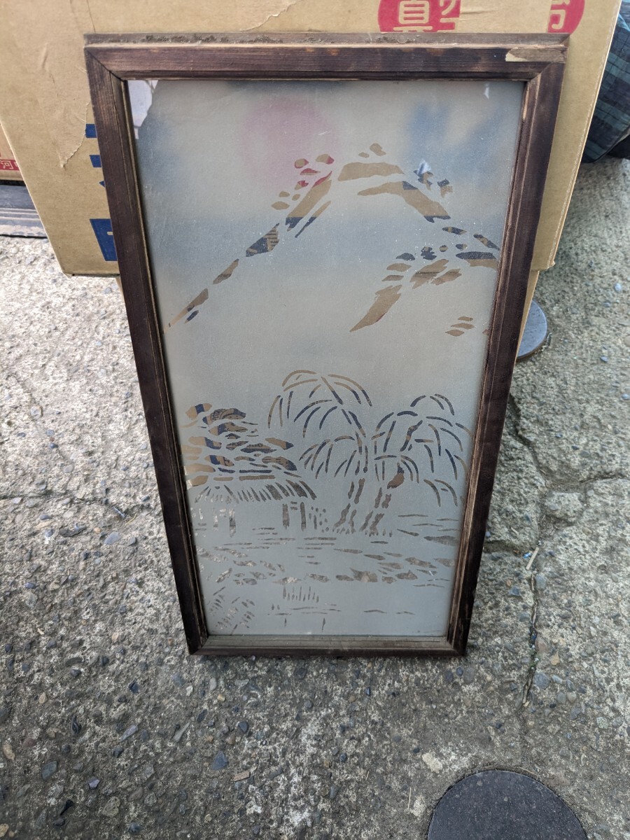 - 欄間 くもりガラス 富士山 ガラス画 当時物 大正時代 旧家 横24×47センチ