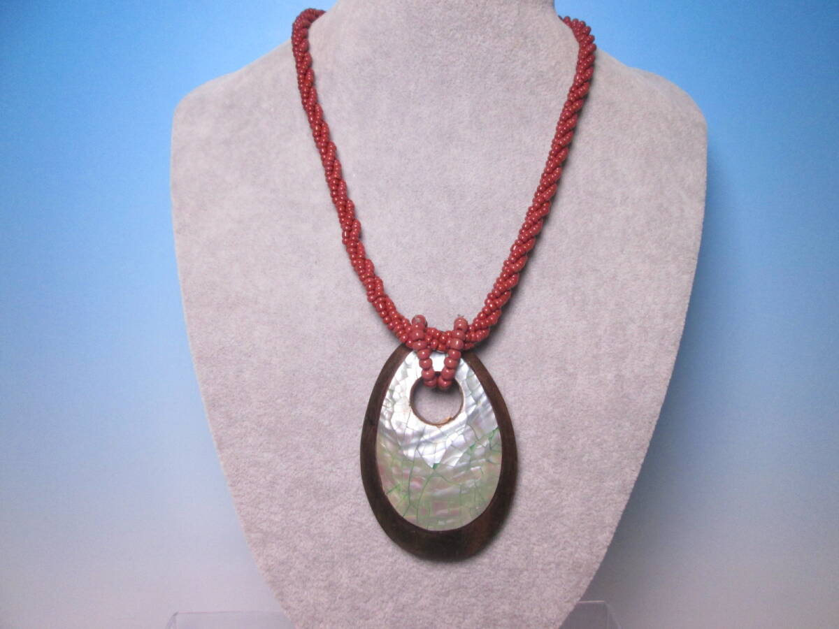 - ☆木製 螺鈿モザイク細工ペンダント&ビーズネックレス アクセサリー