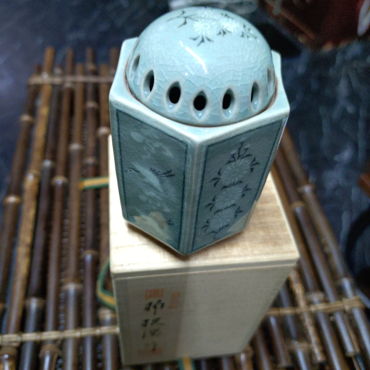 - 六角青磁香炉 韓国人間国宝 柳根瀅(海剛) 雲鶴文 共箱付