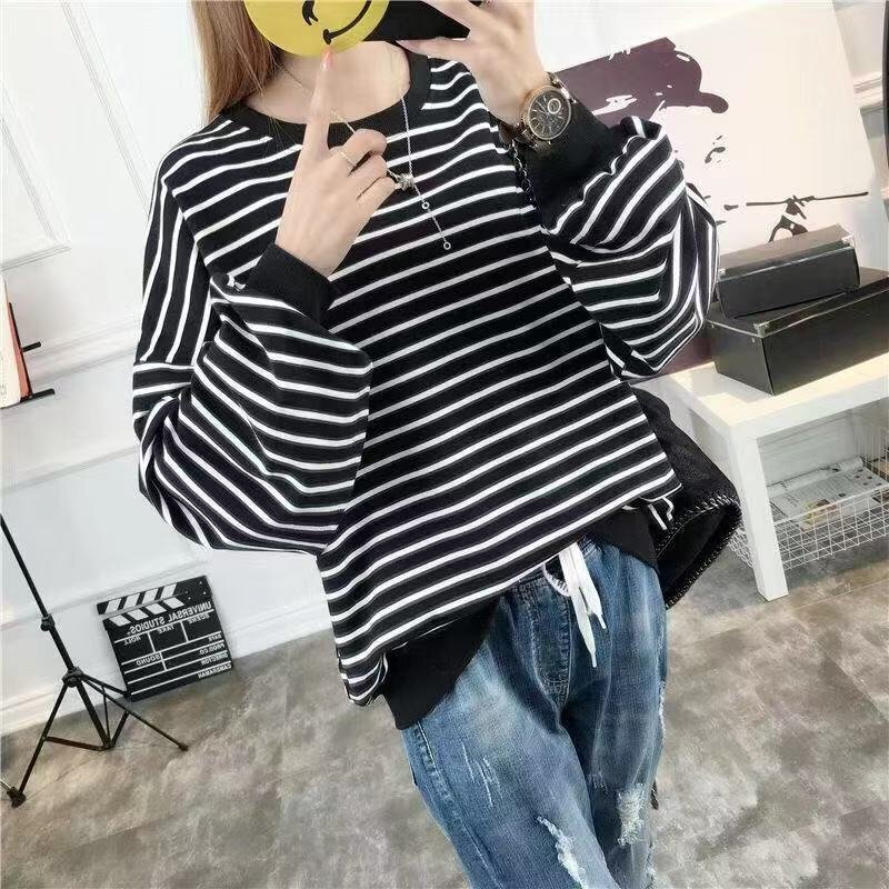 - LRM4443★トレーナー ボーダー柄 ロングTシャツ カットソー 大きいサイズ レディース 薄手 春秋 ゆったり 丸首 長袖 カジュアル